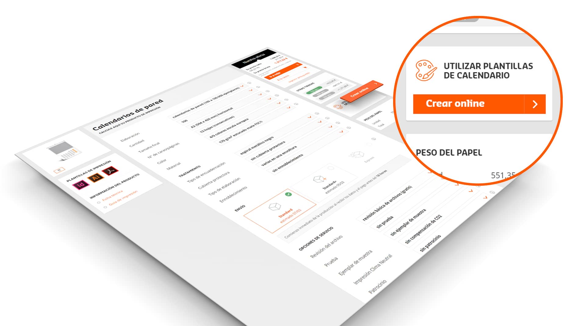 Seleccione en el configurador la cantidad deseada, el formato, la orientación y las opciones de servicio. Estas opciones no las podrá modificar a no ser que interrumpa el proceso de pedido en el diseñador.