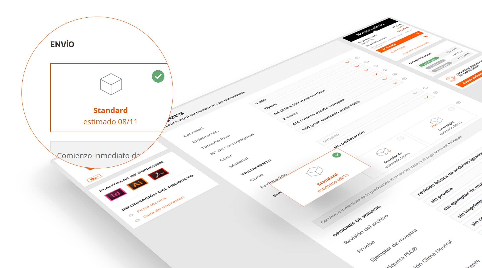 Además del envío estándar, también ofrecemos opciones de entrega más rápidas, como la opción Estándar+ o de un día para otro para pedidos de última hora.