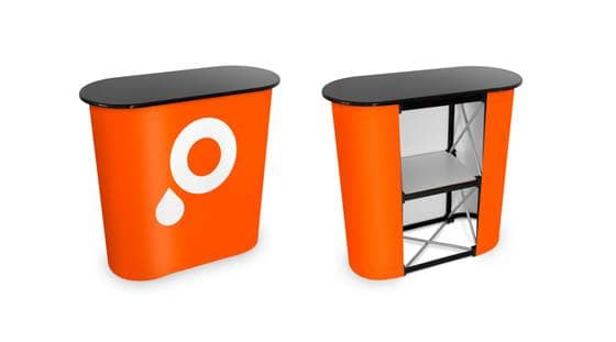 Mostrador oval de feria, impresión alrededor del mismo y banner de PVC